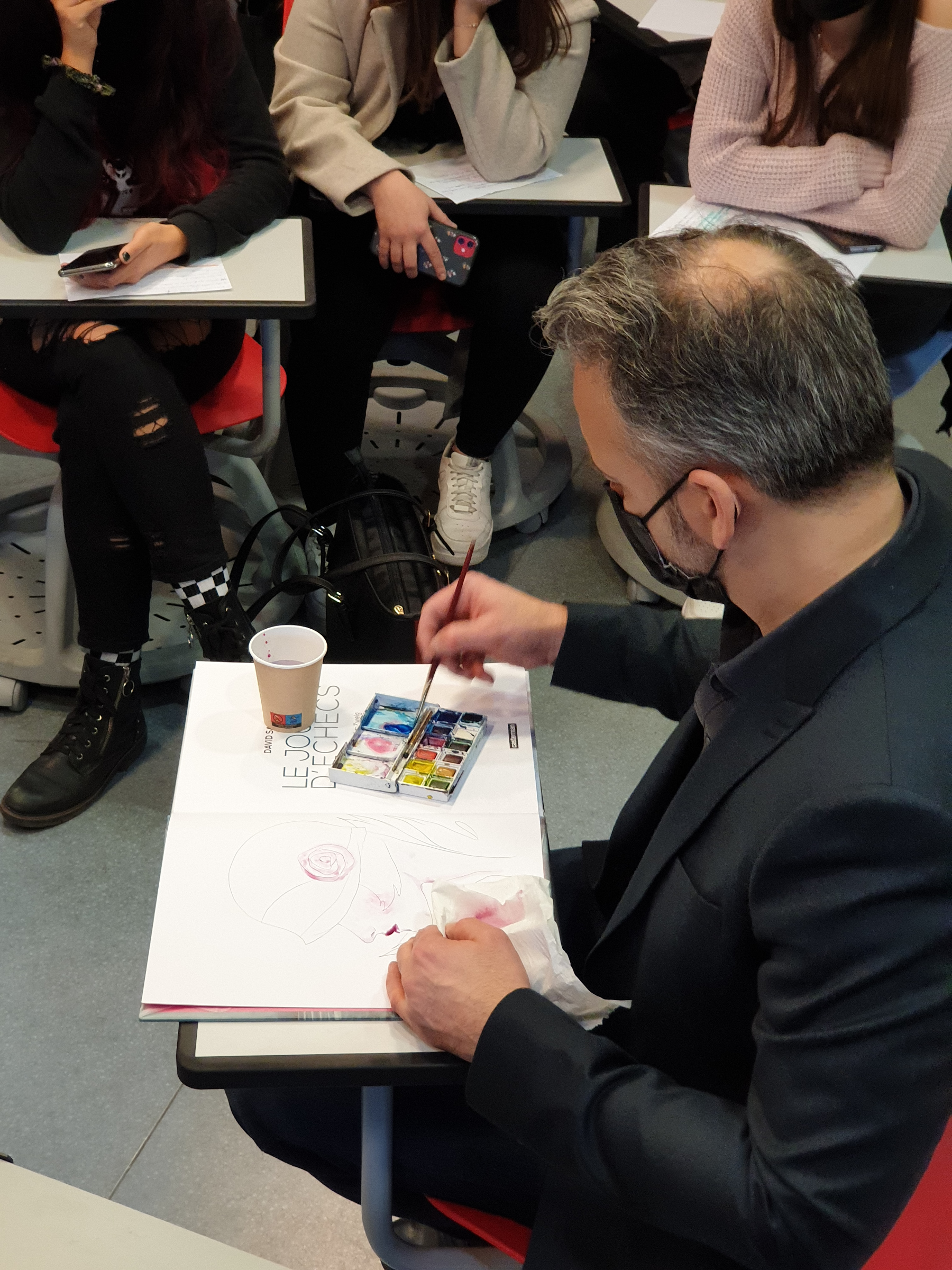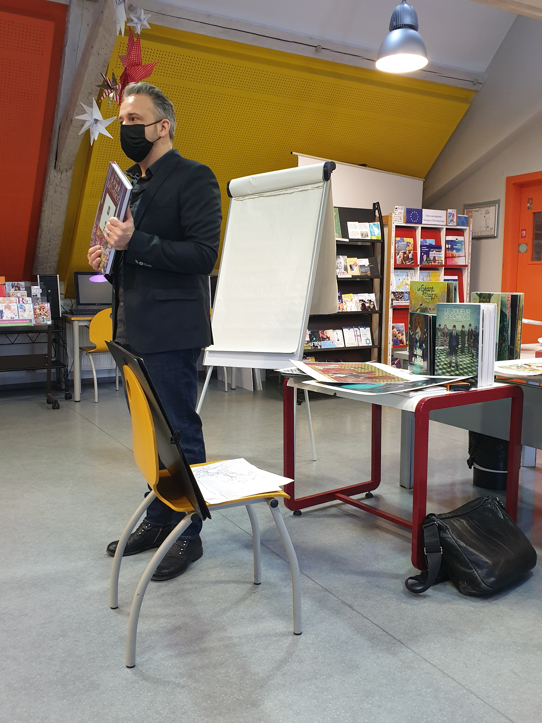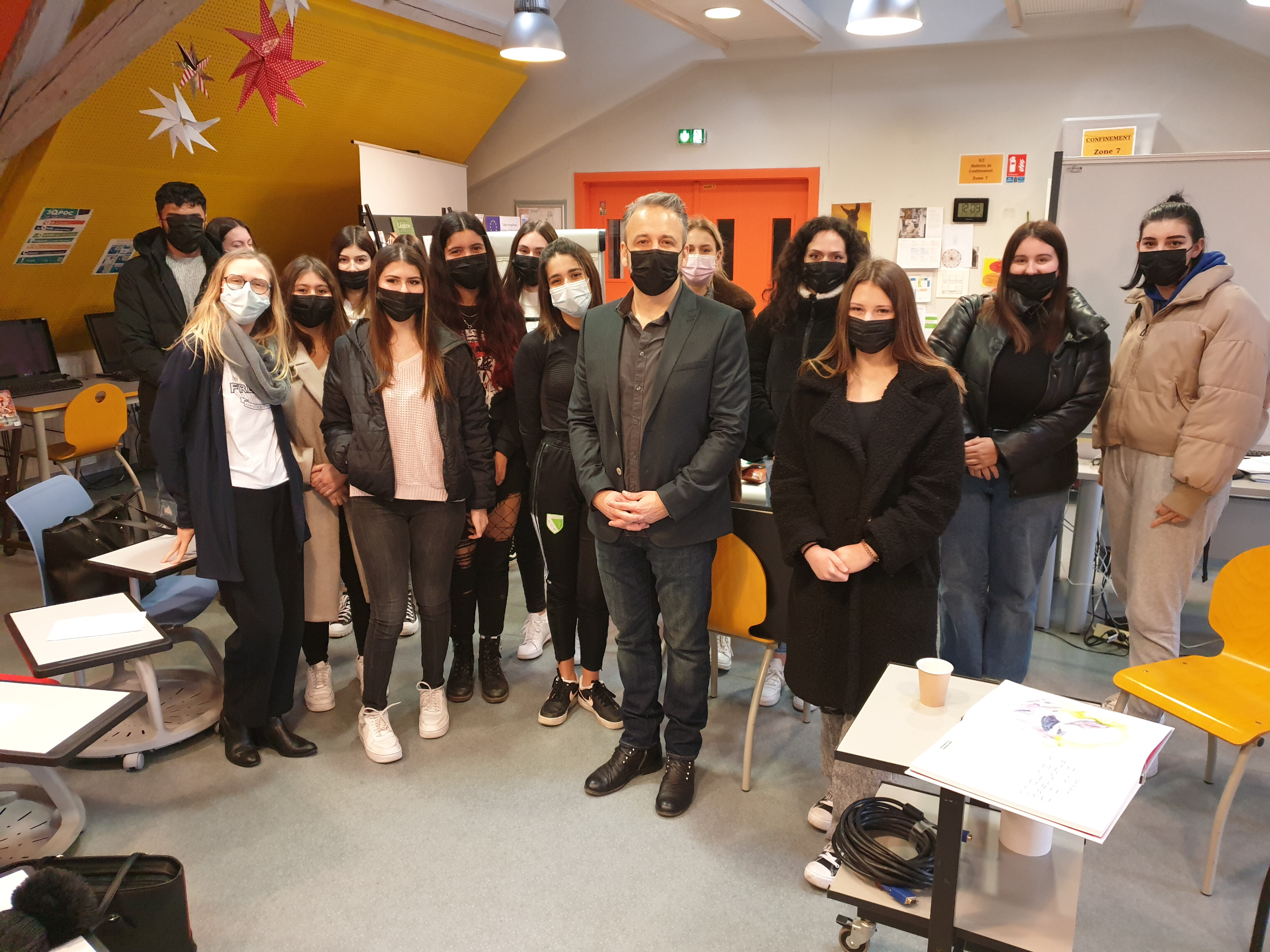 Les élèves de TMCV-A2 et TMA, terminales Métier du Commerce et Métiers de l’Accueil, ont travaillé en cours de français sur son adaptation en BD du Joueur d’échecs de Stefan Zweig et l’ont rencontré séparément pendant 1h30. La rencontre s’est faite autour des nombreuses questions que les élèves avaient préparées avec deux interviews plus axées sur ses principales BD : Le Joueur d’échecs, par Olivia Cortese (TMCV-A2) et son dernier ouvrage autobiographique, sorti en librairie la semaine dernière, Le Poids des Héros par Gaëlle Bodin (TMCV-A2)