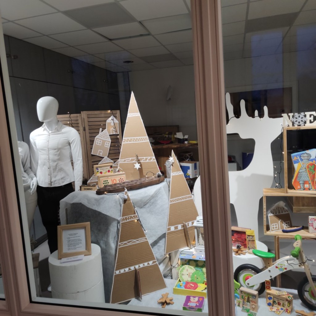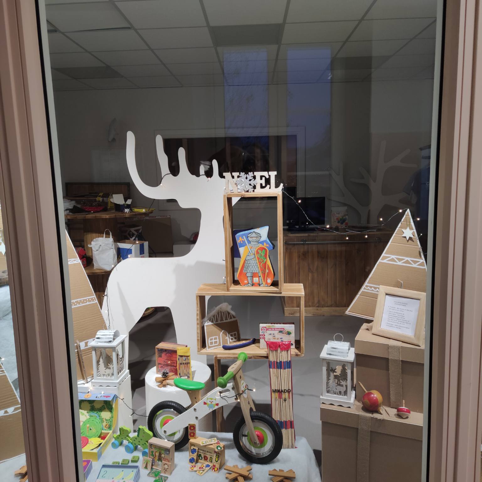 La « vitrine de Noël » : une réalisation de la classe de terminale CAP Equiper Polyvalent du Commerce avec comme thème les Jouets en bois et les jeux en matériaux recyclables.