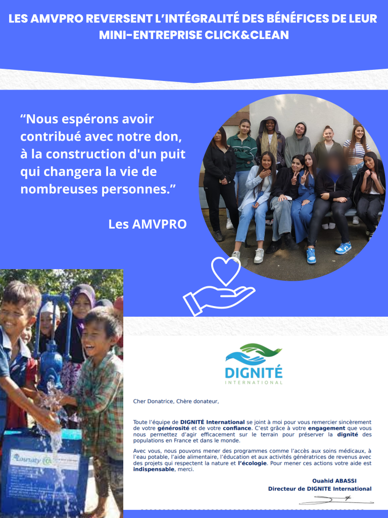 Les élèves ont récemment pris une initiative remarquable en faveur d’une cause humanitaire. En effet, tous les bénéfices récoltés par leur mini-entreprise Click&Clean seront intégralement versés à une association caritative (Dignité International) pour la construction d’un puit en Asie. Une initiative qui vise à fournir un accès à l’eau potable dans une région défavorisée.