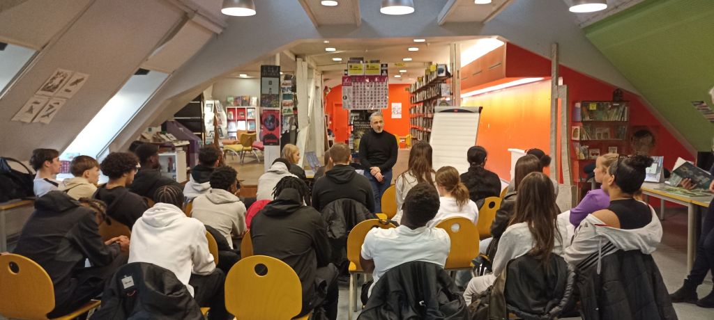 Dans le cadre des rencontres d’écrivains organisées par la DAAC avec le soutien financier du Gip-Acmisa, les élèves de 2MRC3 et de MCAD ont eu la chance, mercredi 24 janvier 2024, de rencontrer David Sala, illustrateur pour l’édition jeunesse.