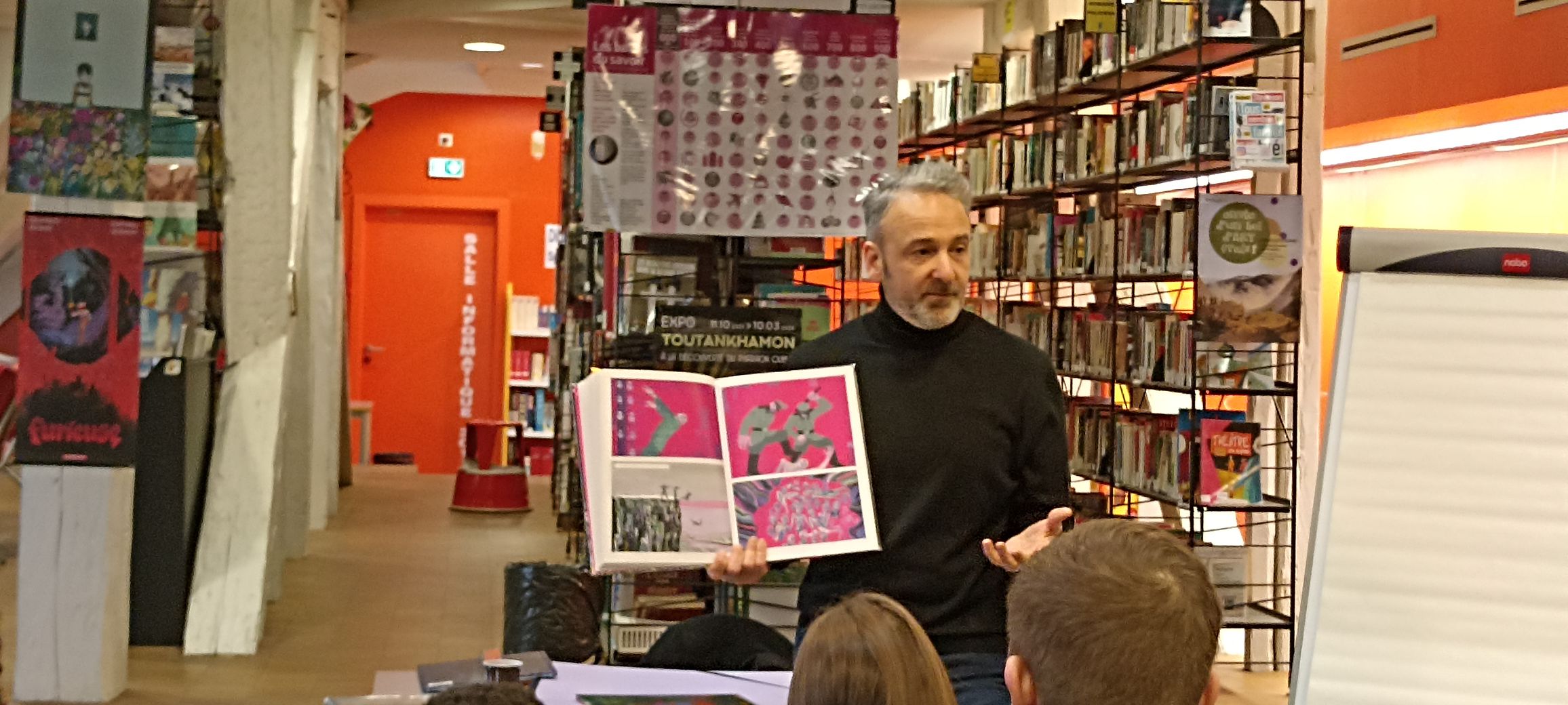 Afin de préparer la rencontre, les élèves se sont plongés dans l’univers de David Sala, connu pour ses illustrations pour l’édition jeunesse comme La colère de Banshee, Le bonheur prisonnier, Le coffre enchanté, Féroce, entre autres, mais aussi pour son adaptation en BD du Joueur d’échecs de Stefan Zweig. Son album Le poids des Héros, est un récit personnel autobiographique où l’auteur retrouve son regard d’enfant pour évoquer l’héroïsme de ses deux grands-pères.