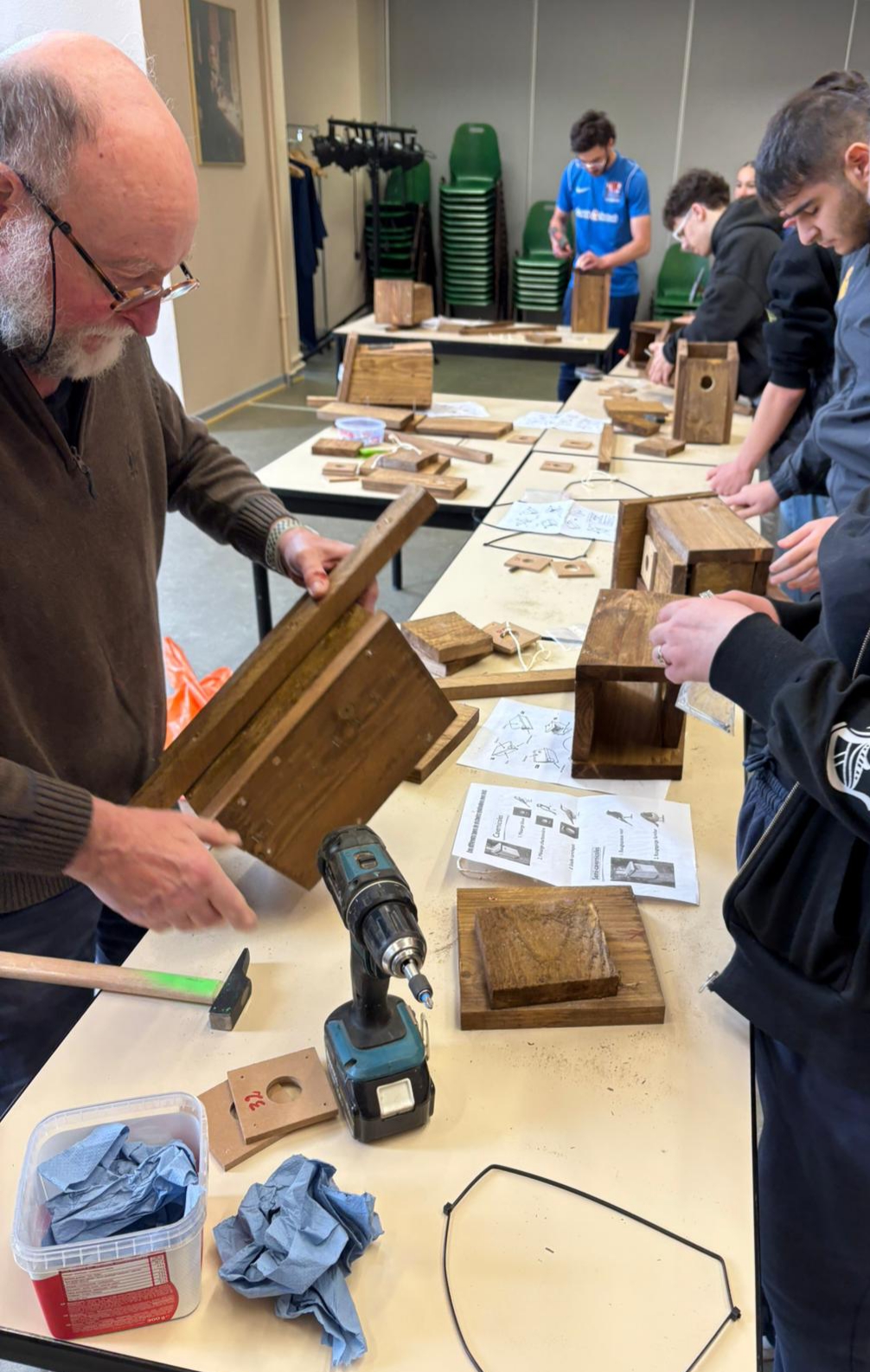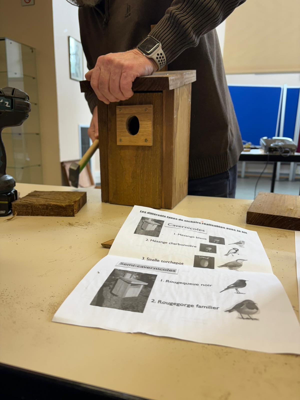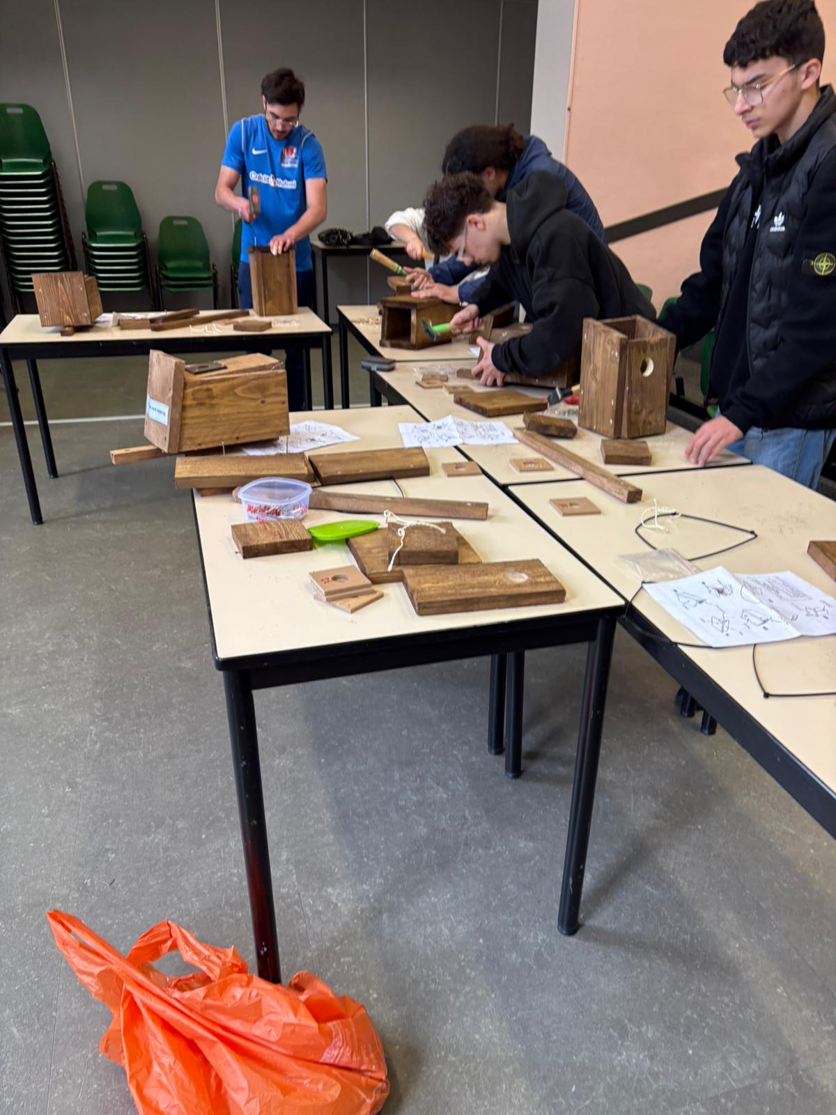 Après une présentation des oiseaux cavicoles, cavernicoles et semi-cavernicoles, nos jeunes se sont attelés au montage desdits nichoirs avec le plus grand enthousiasme et la plus intense concentration. 11 petites maisonnettes ont ainsi été élaborées et seront prochainement fixées aux arbres des deux cours du lycée.